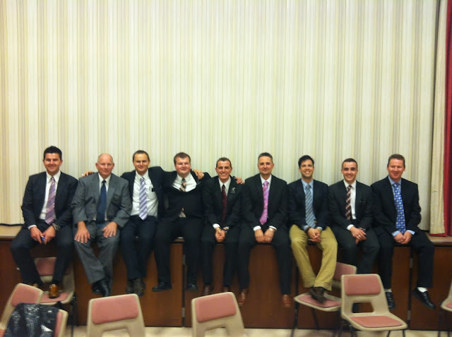 Photo of the missionaries: Left to Right Wilson's, Wilson's, Johansson's, Gibb's, Gebhardt's, Jeppsen's, Pilkington's, Brinkerhoff's and Allen's